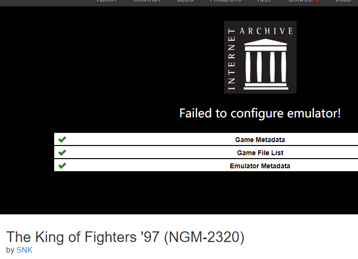 The game I played on Internet Archive is The King of Fighters 97. It is a 2D fighting game developed by SNK and published in 1996. I chose this game because I am very familiar with it since I have been playing this series for more than 15 years. The emulation was clunky and buggy. After 5 minutes playing it, the emulator dysfunction and shows a white screen. I have to reload the web page, and it just stuck at the loading screen forever and ever. (picture 1)